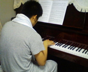 大人の方『毎日ピアノ5分』練習イメージ。お風呂前の練習。 出演は、わたしの弟です(笑) |
