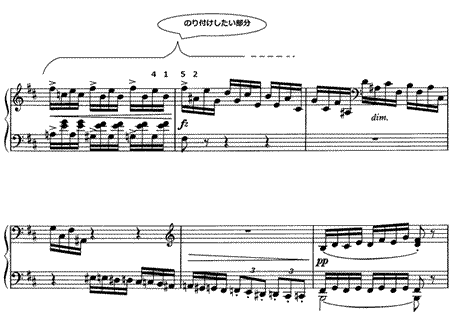 すると、1小節目の最後の音が、1の指(親指)で終わっているため部分練習の頭の所のFシャープとAシャープを5(小指)と2(人差し指)の指で弾く場合、手の大きさにもよりますが、ほとんどの場合、部分練習した時より親指が中に入り、手首が上がっているはずです。