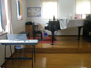 | レッスン環境 | レッスン室は約18畳でステージ付き。 レッスン室ステージ上にはヤマハグランドピアノ、ヤマハエレクトーン完備 住居とは独立した建物ですので、落ち着いてレッスンできます。 隣の部屋に約10畳の広い練習室があります。 練習室にはヤマハサイレントピアノ・キーボード・ドラムセット完備 毎日生徒さんにご利用いただいております。 |